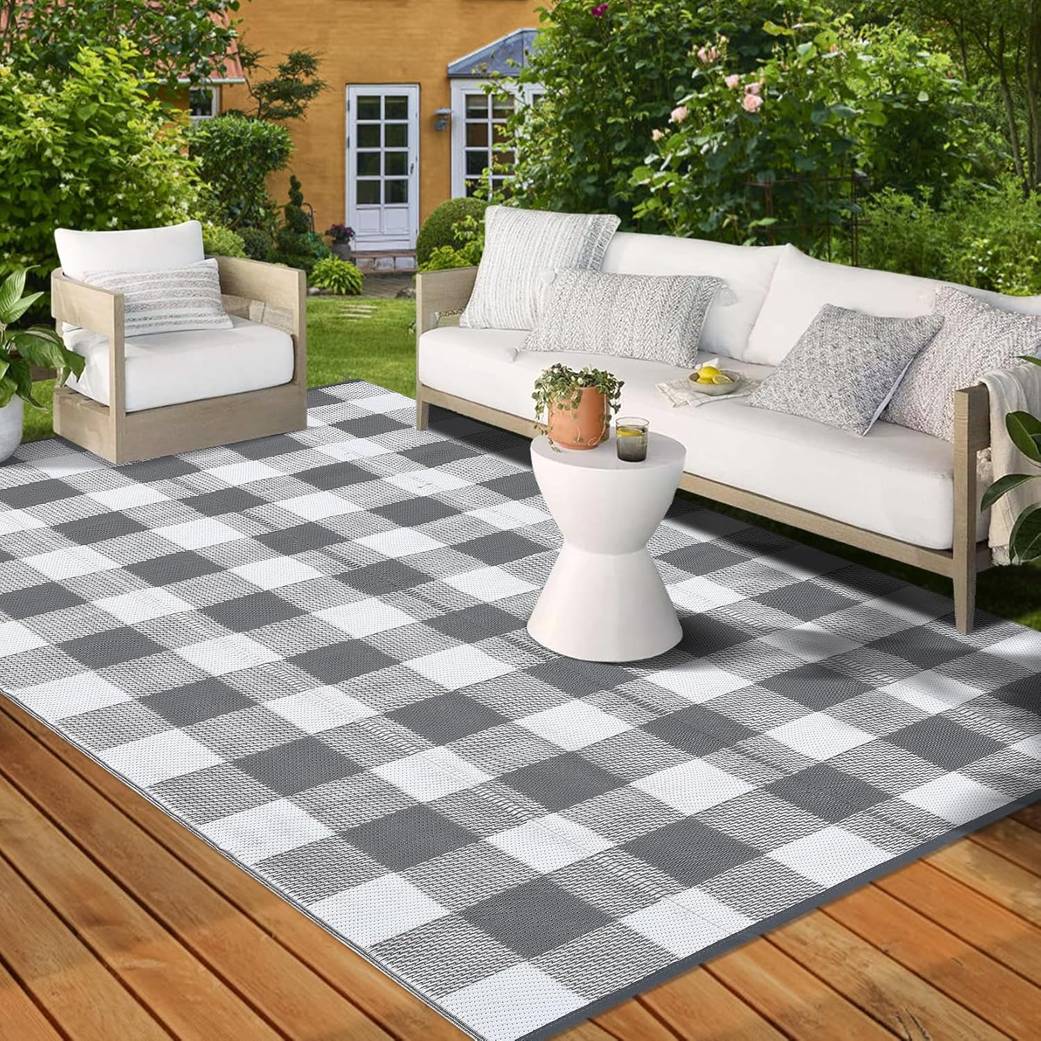 **Product Title:** Outdoor Rug 8×10 Waterproof Patio Rug – Modern Checkered Reversible Plastic Straw Mat for RV, Camping, Picnic, Beach, Balcony – Grey/White